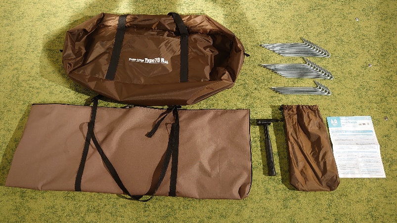 ライナーシート、張り綱3mx6本、スチールピン25cmx25本、アイアンハンマー1丁、収納袋